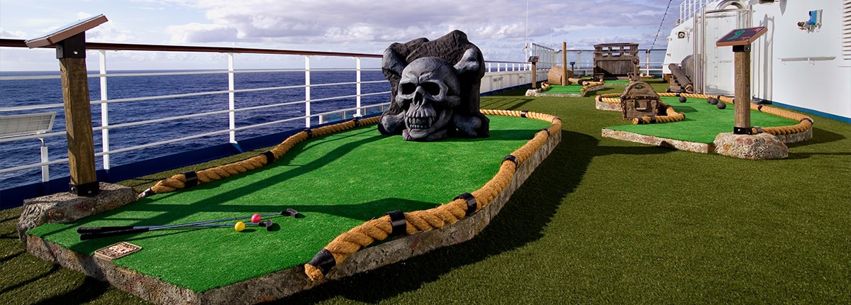 Ah, imagine a perfect day out on the links, the golfer's zen of the ball, the hole and nothing in between but a well-manicured fairway... plus one cactus, a treasure chest... and wait, is that a windmill in the way? Just who designed this course anyway? Whoever it was, they had one thing in mind — maximum fun for mini-golfers, big and small! That's precisely why you'll find a course on every Carnival ship, where you can hit the holes and take in everything you’d expect, like the sights and the sounds... plus the seagulls.